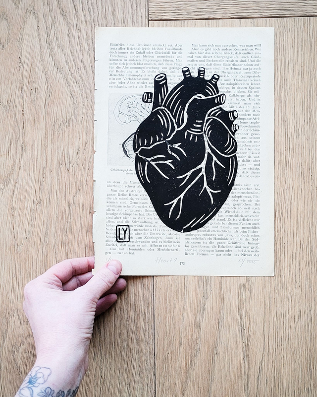 The motives are printed by hand using linocuts, designed and carved by me.
