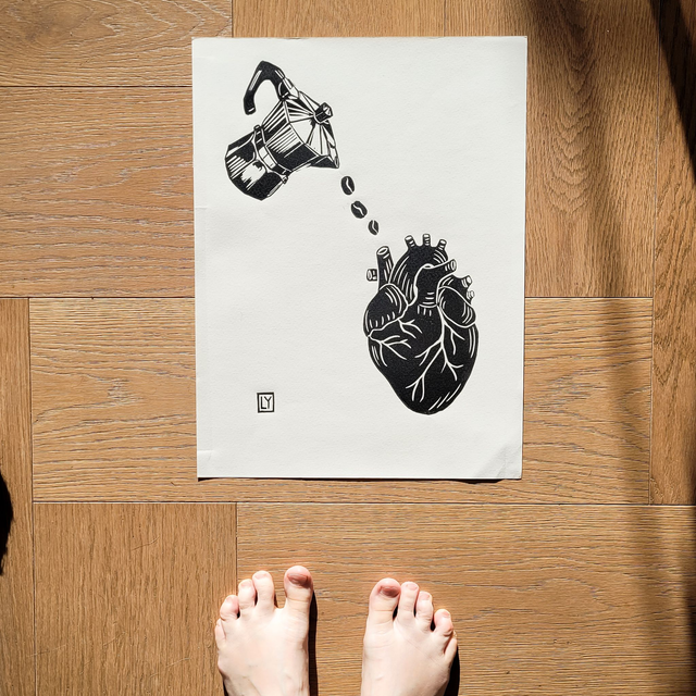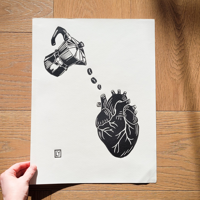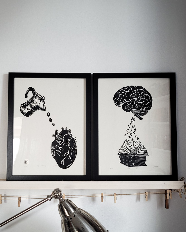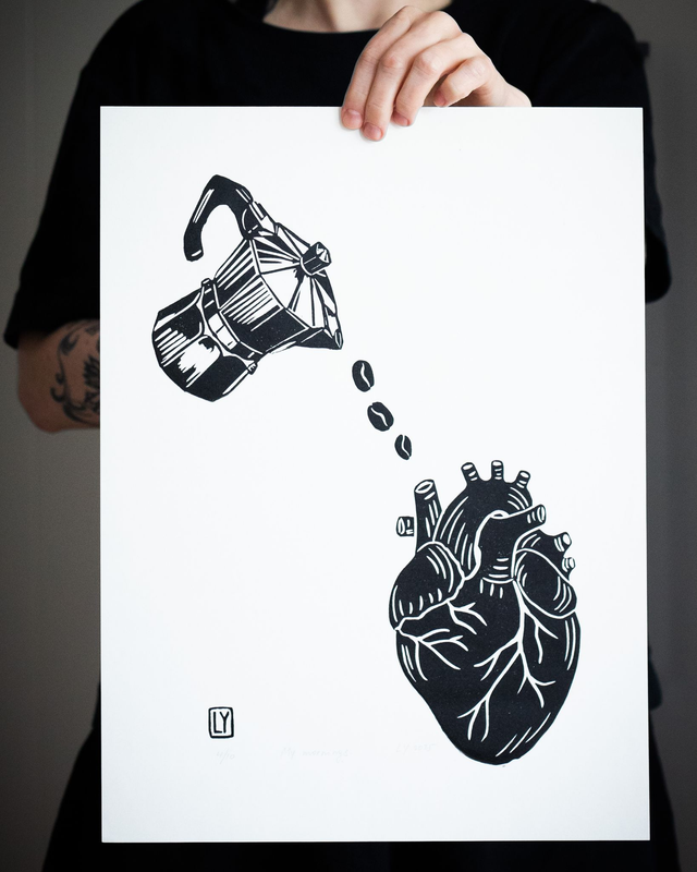 Original hand pressed lino print. The motives are printed by hand using linocuts, designed and carved by Lana Yanovska.